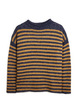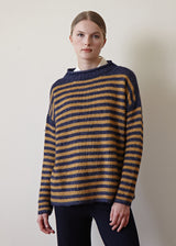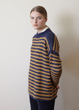 A stunning striped light and fluffy alpaca version of the traditional Guernsey sweater . Oversized just right to dress up with a skirt or dress down with our Margo knit pants. The softest sweater you will own this fall!